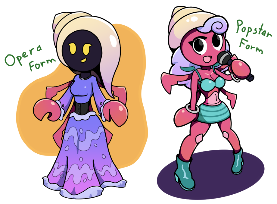 Valerie is a rising singer/songwriter who struggles to manage her two personalities, both of which having their own form and appearance. Her opera form on the left is very shy and reserved, often keeping to herself unless need be. Her popstar form on the right, however, is much more vibrant and outgoing.