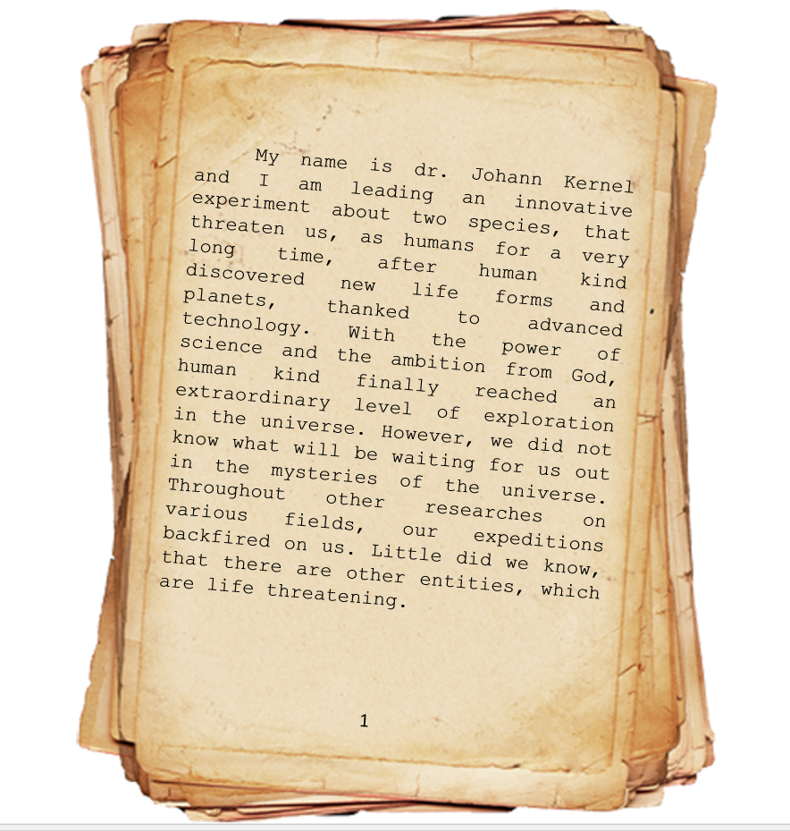 This project is about a Xenomorph and Yautja, that are under several experiments lead by humans. The story is described and "written down" from a human doctor's perspective, but is heavily based on the mentioned Xenomorph and Predator.