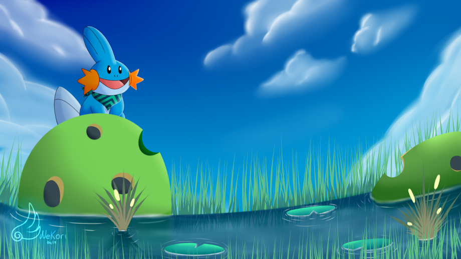 In this one i drew Mudkip in his Friend area Peanut Swamp :D I really love the idea that every pokemon have his area to live so .... i really love to make this :D I hope that i will make another one with torchic and treecko of course!