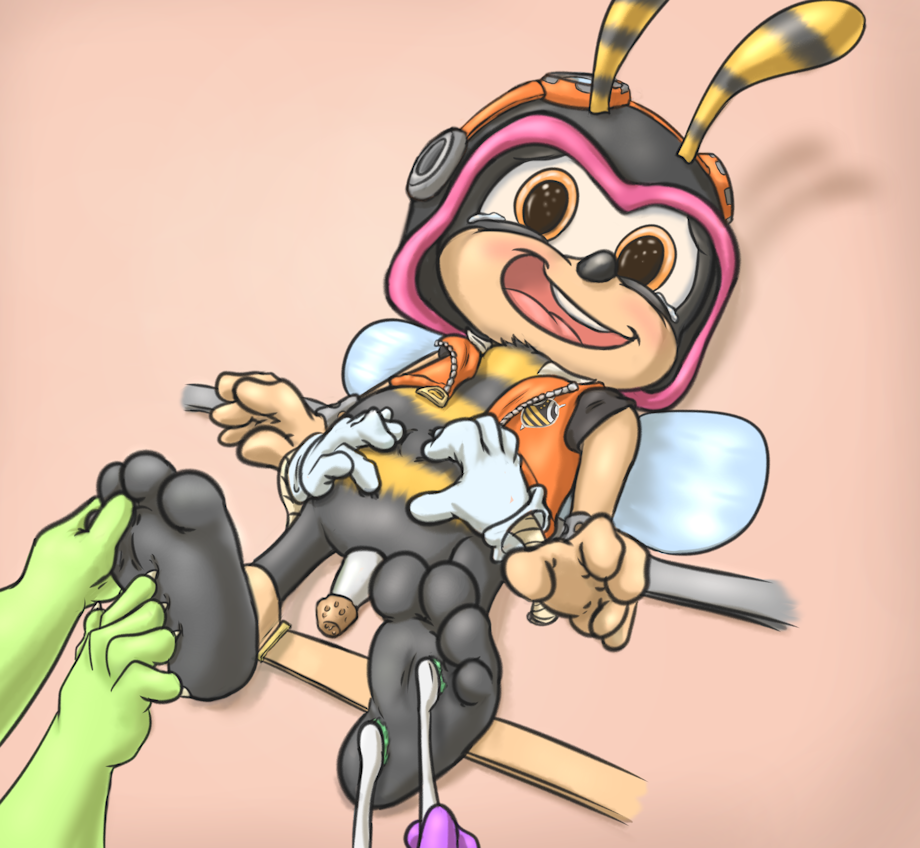 For a little guy, he's quite the flier. Strong enough to even carry around Vector's hunky butt in the air for a time. But during the last job, Charmy nearly dropped Vector into a pit of vipers,piranhas, and clowns. And that would've been no good. So! Now he gets a rigorous endurance training course. Endurance, stamina, lung capacity, the works. When he can go for a full hour of getting tickled without passing out, he'll be ready. His current record is twenty minutes. And if he'd stop struggling so much when they wrassle him into the straps, they wouldn't have to cork his stinger. Last time he got Vector right in the snoot. He looked like Goofy for two days. So much for those many good manners. =P