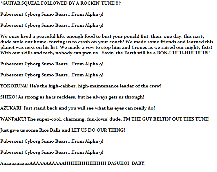 The Origin Of The Sumo Bears (What Wanpaku tried to convey in the short amount of time he had): Considered to be the Malgrok of the Haya Belt, Alpha 9 is a planet inhabited by a bear-like race known as Kumasans. The main form of combat on this planet was Kuma (A martial art similar to Sumo). Practitioners of Kuma are called "Kumatori". This planet boasts being a planet where hunger is all but non-existent as they are world of plenty. On this planet live four young, promising...Aheh, I can't sugar-coat it, bear, these guys are a bunch of hopeless klutzes who were lucky enough to have passed their exam to being standard level Kumatori...And that's only because the guy running the dojo they were training in (Yoko's father) got tired of having to replace the toaster every two months. <i> How </i> hopeless? Let's just say those cybernetics AREN'T required equipment for being a Kumatori and leave it at that...Poor Azu lost his baby blues on a dare. <i> How </i> lucky? Well, one day, the four bros decided to have lunch at a new quadrant-side diner Wan heard about through his news feed. Meanwhile, back on Alpha 9, the sky turned an unusual Maroon color (The sky is normally Green). Just then the planet shrank and was taken into a small box by a raptor-looking figure who calls himself the "Collector King". A colony of Kumasan settlers (Who were conveniently running the aforementioned diner) informed the boys of the situation. As literally the only Kumatori who weren't on the planet at the time, the elder of the colony tasked them to chase after the Collector King and restore Alpha 9 to its rightful place on the Haya Belt. The boys in hot pursuit, of him, the Collector King shot their cruiser down onto the planet Earth. There, they crash-landed at a lakeside Sumo dojo in Bearsdale, Chicago where a wise old retired wrestler turned Gyoji named Hanzu Korazuma and his niece, Sashimi. They took the four in as it fell to Azu to repair their ride. Suddenly, it was learned that the Collector King decided to add the Earth to his collection. It's now up to them to prevent this from coming to pass...And, it's up to Yoko to keep his sanity among his flaky friends and keep them on task. Will the four Kumatori be enough to stop this madman and save their home? What outlandish hijinks will ensue along the way, how rediculous are the other enemies they will soon face? If this were a TV show, I'd tell you to tune in and find out.