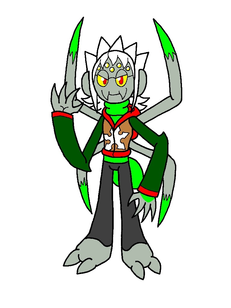 After a fierce transmutation this version of Kevin became a humanoid spider, with four additional spider-like legs (each with a crystallise tips) and has gained great new abilities (sticks to walls, jumps higher, shoots webs from mouth & butts which turns to green crystal when hardens, and sometimes spray paralysing poison) although he still seems to be scared of almost anything.