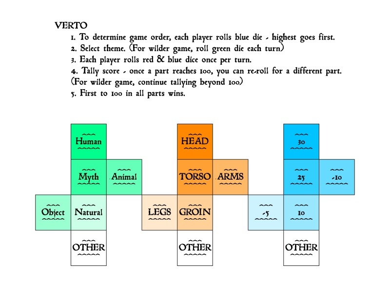 A little dice game I worked up, the goal is to score 100 for all "parts"...it totally is JUST a game and absolutely will not have any affect on reality... Simply print out, cut, and assemble the 3 different dice (or glue to the faces of existing dice). Thanks for the inspiration, :iconscot158f: