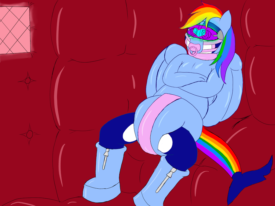 Mmph; well, seems that the dichotomy of being a "fierce shark" who also loves a certain blue Pegasus-pony has finally driven Mako around the bend! ... That or this is just a shark or raccoon's idea of a "birthday surprise" for Mako. Either way; he's stuck in a padded room with thick padding, dashie-themed straightjacket and hypnotic visor. And oh well: maybe he has his plushies and that's all the party-guests he needs if they are already talking to him!