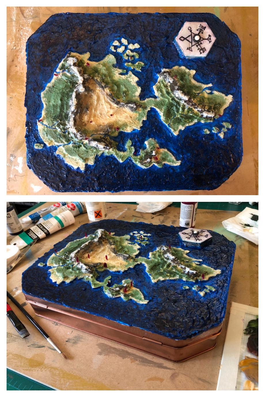 Made from stacked layers of matboard on a candy tin, with acrylic modeling paste and lots of paint. And glass beads as city markers.