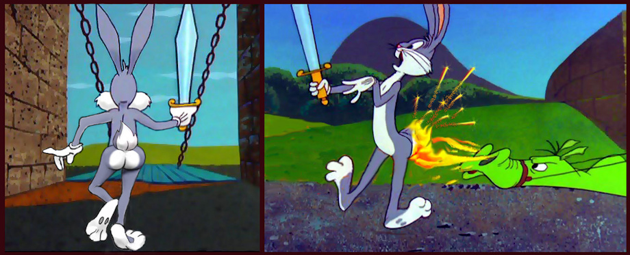 Scenes from the WB toon "Knighty-Knight Bugs," which have been tweaked by yours truly. Twerking is by Bugs Bunny, who is property of Warner Bros. and their associates. That goes for the dragon, too. Dragonmaster Yosemite Sam is off-camera.
