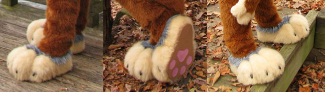 Produced recently for Rory Husky for his new coyote, Kayak Kioti. They feature paw pads in the soling, and a zipper allowing easy access to put on and remove the feet.