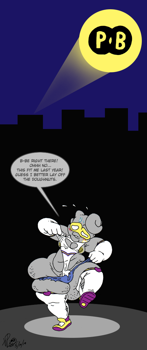Recent trends in superhero stories love to show the hero in their day-to-day life as much as possible, but they never touch on the reality of squeezing into that uniform, especially when it's been a couple months since you fought crime and your part time job is at a doughnut shop with constant temptation all around you; a problem poor Power Bottom knows all too well. Thankfully, a couple hundred extra pounds don't hinder his innate abilities much, but actually getting there in time? That's a different story.