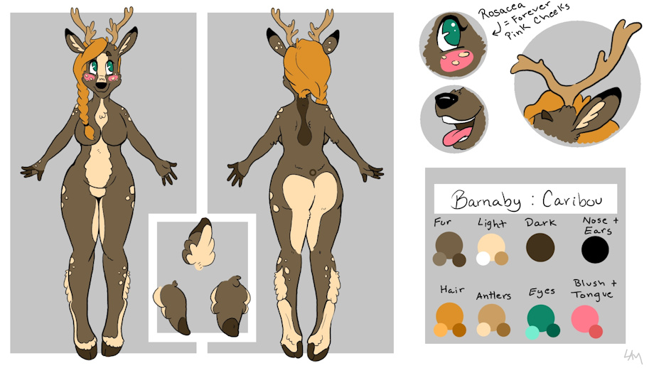 Pear shaped body with big gazoongas. Standard reindeer coloring with flecks of white spots on the limbs and cheeks. Has rosacea, so her cheeks are always rosey. 6 prongs on each antler.