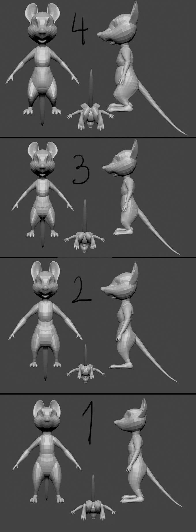 So had some time and did few variations of the simple mrs Brisby mesh. Which direction would you prefer? I think number 4 is closest to the drawn version. Not very close yet though. Don't pay much attention to the head / arms etc. as those are very rough at the moment. Body proportions are more important at this state. Open to any critique though. I'm not sure If I've found the right body shape yet.