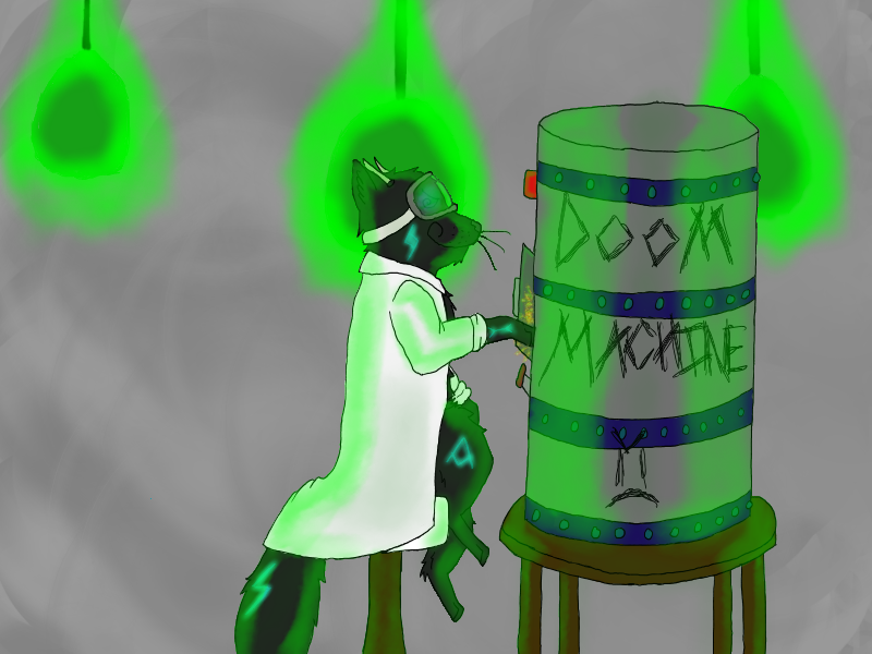 Insaniteh! D:< I mean, just LOOK at that doom machine. Just looks menacing, doesn't it? >.> And, those things in the background are evil scientist-y lights. :D I mean, you can't be an evil scientist unless there's something in the background casting a green glow. <.< For srs. Anywho! This is Ecu's character. It was a request by him, and I hope he likes it. :D I worked hard on it!