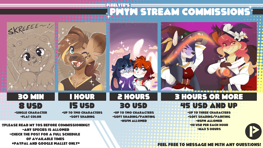 EMERGANCY PWYW Commissions!! 8 USD per Half Hour, 15 USD per hour! Please Read: Due to current circumstances I will be opening timed stream slots again. I will be working on these and my current queue all of next month, so if you commissioned earlier do not worry it will also be done next month! I'm in a rough spot again putting me to the point of not knowing if I'll even have a place to go to next month and while staying at this apartment is not ideal it's the only place I have. The landlord is threatening to kick us out via eviction, tomorrow. A mail issue made it to where the check for last month's rent didn't make it to him and I'm trying to get the money back from the check and this months rent quickly enough to make things right but it's taking to long. I've been art blocked and over stressed so here's my last go at it. I'm going to be looking for a new place to stay up until the last day of this month. Not only am I dealing with this issue with the guy but anytime we ask for repairs to things he hardly ever takes the time to come over and fix them, hell we don't even have screens in our windows. So here's how PWYW works ✨Read my TOS and PWYW Rules: https://bit.ly/2I9HdBR✨ Please read over the rules carefully, most pieces will be completed as busts or more. Every piece will have coloring. ✨Check for an available date and time: https://docs.google.com/…/1kI0pHRzNHXyypDFNyr1pPFOE1W…/edit… Every blank spot is a free spot! PM me with: Name: Hours: (amount) Start Date/Time: Pose: Ref(s):