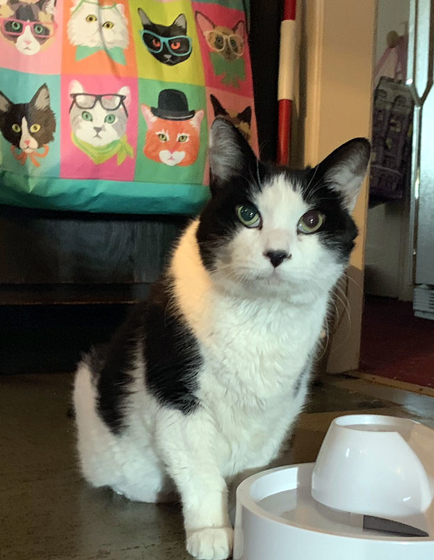 I could go on about this character, but we're still pretty sad and we miss him terribly. His death was slow (kidney failure from cancer) so we had time to gird ourselves and shower him with attention, but when the end came, it was still a heart-break. This pic I took last April 1st shows Che breaking the fourth wall in front of a kittified tote bag. (I'm sure he knew what he was doing.)