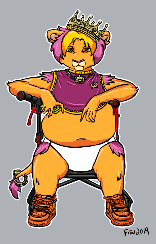 This is a picture of my character (the orange and pink furred lion) dressed in a purple and gold bib, plain diaper, and orange Gatorade Jordans. Around his neck is a gold plated pacifier. In his right hand is a green outdated iPhone. Upon his head he is wearing a royal-styled crown, leaning on his left ear. This crown sports the inverted Great Diamond Authority emblem.
