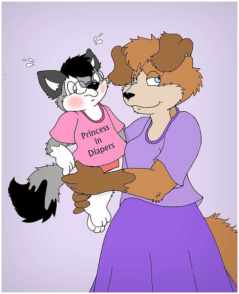 Here is a family portrait of the "queen in training" and the "princess in diapers" of the Nursery court. What is the occasion ? Whose is to say ? Maybe it is in preparation of the adoption papers signing for a certain wolf... or before going out in a fancy restaurant ? Or going to see the grandparents ? Whatever the occasion, I don't like the outfit... my diapers are visible ! everyone will think I'm a baby ! And my t-shirt says princess ! Huff huff !