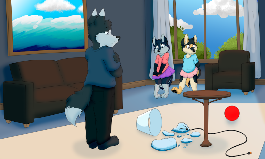 It was a sweltering hot summer day, the girls were done with school and Koda was relaxing in the other room cooling off after doing some yardwork. Amana and Alara looked outside their back door seeing the heat coming off the concrete. They really wanted to play outside and they didnt want to burn the bottoms of their feet. Alara holds a bright red ball in her hands whimpering softly because she wanted to play, then an idea popped into her head. "Hey Amy, lets play inside" her twin sister looks at her and shakes her head. "But daddy says we shouldnt play ball in the house" The playful pup nudges her sister on the shoulder. "We'll be careful. Come on lets play." Amana knowing better reluctantly agrees as they slowly pass the ball back and forth with their feet dodging around the furniture giggling as they chased after each other. Alara smiles and yells out to her sister. "Hey Amy, heads up!" She yells and kicks the ball but misses her sister as it collides with a lamp in their living room as it lays in a shattered mess on the floor. "Allie! You broke it." The pup yells back which makes Alara yell back. "Well, you shouldve caught it!." Then they heard a voice that made their tails shiver. "Girls! What was that? They start to panic. "Nothing daddy!" They hear footsteps coming from where Koda was resting. "That didnt sound like nothing." Koda walks into the room making sure his girls were ok seeing his little girls, the broken lamp, and the ball as he put things together and folded his arms. "One of you mind explaining to me why you played ball in the house when ive told you not to?" The girls nervously plays with their skirts looking at the floor knowing what was coming after breaking one of the house rules. Then Amana spoke up. "It was hot outside daddy." She then points to Alara and whines "But she wanted to play inside!" Alara tried to protest but i stopped her by holding up a finger which they knew meant to be quiet. "And did you stop her? No. I heard you both giggling and playing." He then knelt down to be eye level with them. "Amana, youre the oldest you should know better." He then turns to look at Alara and then back to Amana. "Since youre both in the wrong breaking house rules as well as a lamp youll both be getting a spanking." They whimper and try to protest knowing it wouldnt work. Koda walks over to his chair and motions Alara over. "Since you came up with the idea and broke the lamp youll be spanked first. Now over my knee young lady." She whimpers and does so. Koda gently positioned her over his knee before folding her skirt over her lower back exposing his white and pink panties before starting to pull them down. Alara tries to reach back and protest. "No daddy please! Please leave the panties on!" Koda grabs her arm keeping her from flailing. "No Ma'am, you know the punishment for breaking house rules. Now move your hand before i use my belt." She whimpers and nods before moving her arm as Koda resumes sliding her panties down to her knees and rubs her cute little butt. "Im doing this because I love you both and i want the both of you to grow up to be respectable young women." Koda then raised his hand and brought it down several times across Alara unprotected backside as she whimpered and cried begging for him to stop. A few minutes on the receiving end of a nice hard spanking Koda helps Alara off his lap and hugs her lovingly helping her out of her panties. "Fold them on the couch and go to the corner please." She sniffled rubbing her arm against her nose* "Y yes daddy." She does as shes told and goes to the corner as Koda looks over at Amana. "Come on baby. Dont make me come get you." She slowly walks over and bends over his knee as he repeats the same process with her like he did with her sister as she folded her skirt over her lower back revealing her pink oanties and pulls them down to her knees as well. "Amana, since youre the oldest and shouldve known better your spanking will be much longer than Alaras. Understood?" *she nodded her head* Yes daddy. *she lowered her head and accepted her punishment well as Koda spanked her for an additional ten minutes. Once it was done he stood her up and hugged her before calling Alara over. She rushed over as they both hugged Kodas neck blubbering and crying saying how sorry they were. Koda gently rubbed their backs and cleaned their faces letting them calm down before seating them on each of his knees. "I love you both very much. Daddy makes these rules to keep you safe. What if you wouldve gotten hurt?" They both nodded as Koda gently held them close as their warm bottoms rested on his knees. "We love you too daddy." The twins said happily before hugging their loving father.