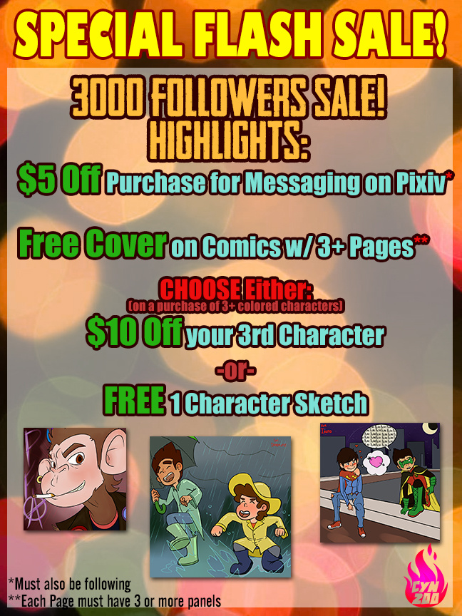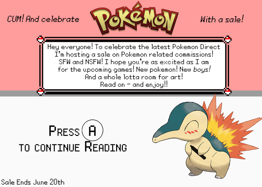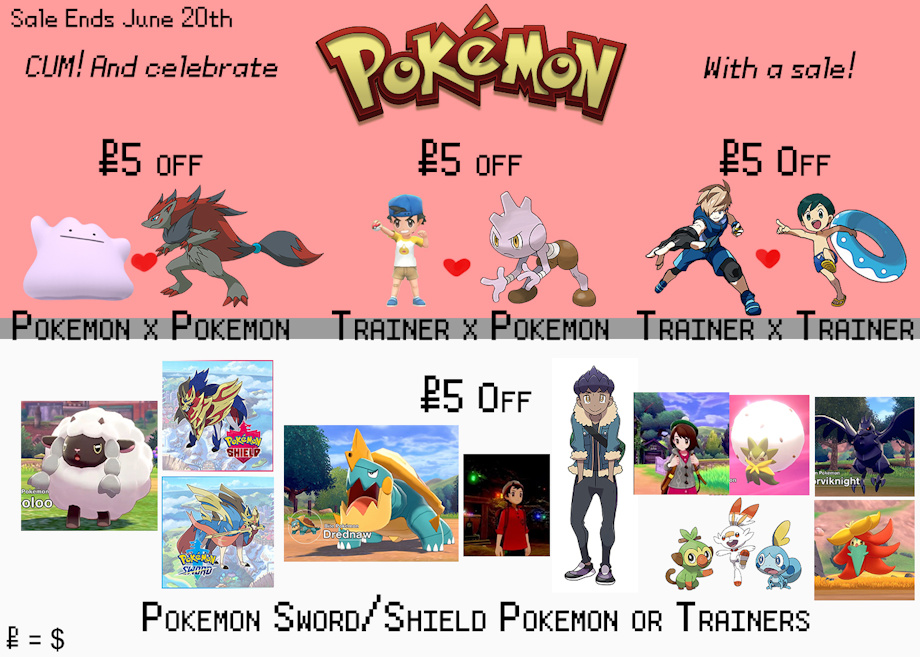 Just repeating what's being said in the pictures! I'm doing a sale from now until June 20th 2019 at 12:00pm EST $5 off any* colored trainer x trainer pic $5 off any* colored Pokemon x pokemon pic $5 off any* colored Trainer x Pokemon pic $5 off all Pokemon Sword/Shield characters/Pokemon Any purchase for this sale will get you a free $5 color wash background unless another background is specified!