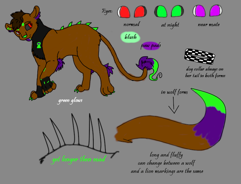 a wolf/lion with brown fur and neon green markings