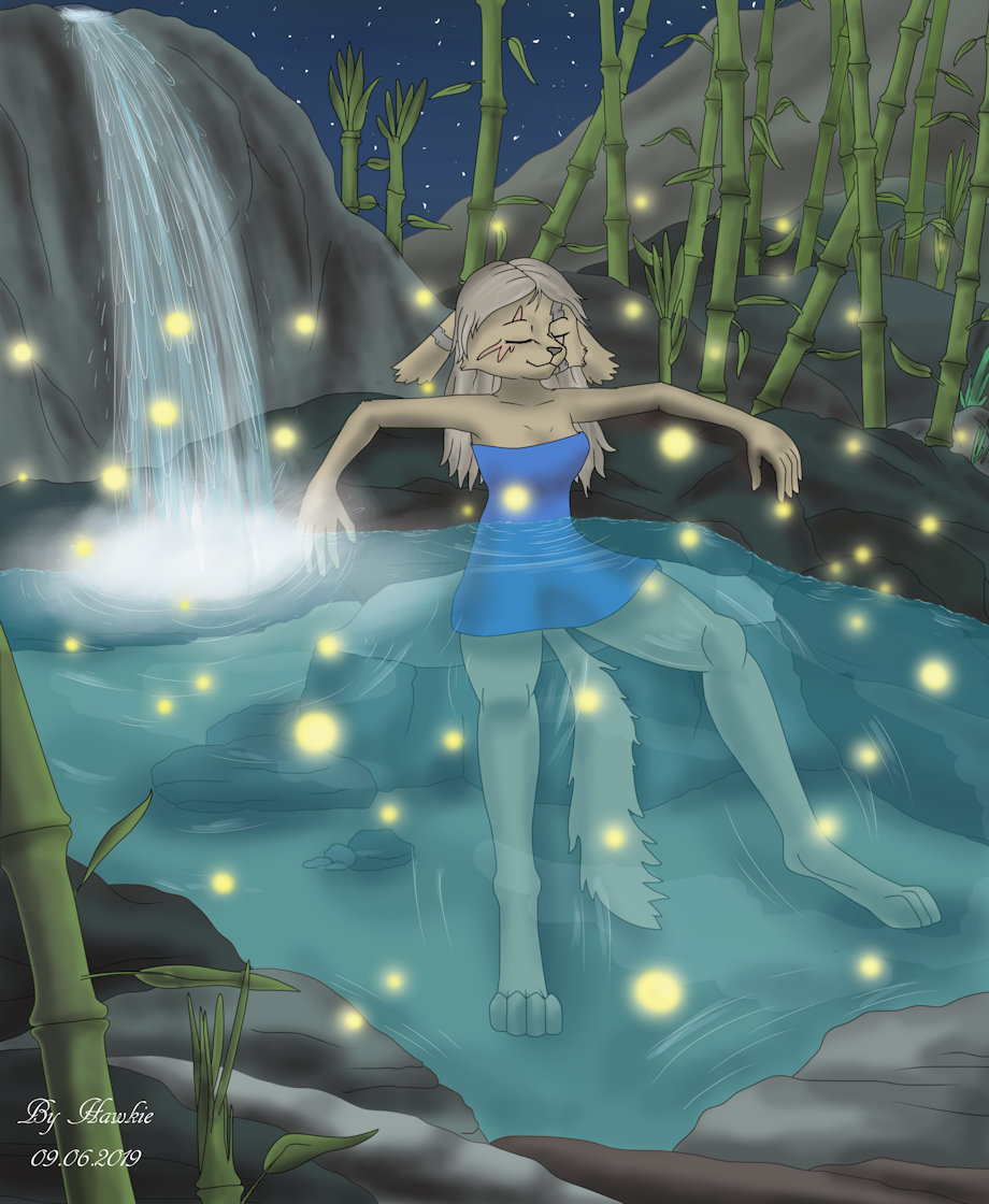 Here we have one of my RP-characters, Nadja Borschek, taking a relaxing bath in a pool while fireflies are dancing all around and the stars are shining.