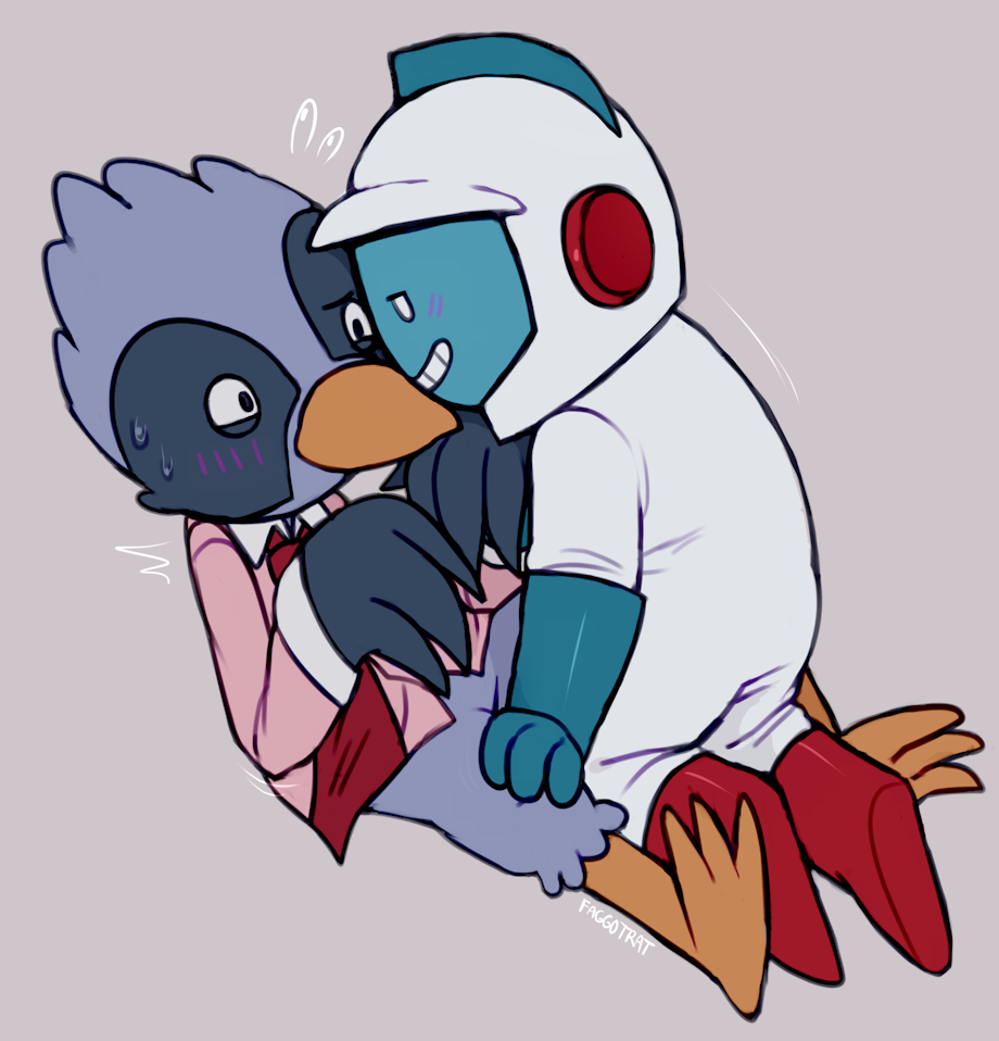 Sky Kid: OOOH, OOOOOH, You're so hard! Dig Dug: Of course I am. You're making me real hard. Sky Kid: And strong too. Dig Dug: Yeah I work out. I have to be strong as I constantly push my drill into hard earth, then I have to pump real quickly to inflate Pookas and Fygars. So I have to have a lot of upper body strength. Sky Kid: OOOH, not so rough Dig Dug. Lemme get used to it, you're so big and strong! Dig Dug: Sorry can't help it. I really get excited once I start drilling through as...err earth. Err strong as earth that's me. Sky Kid: Well give me a chance to keep mah pecker up at least? Dig Dug: It is up and it's beautiful. 'kisses Sky Kid on the beak'. Sky Kid: Awww shucks!