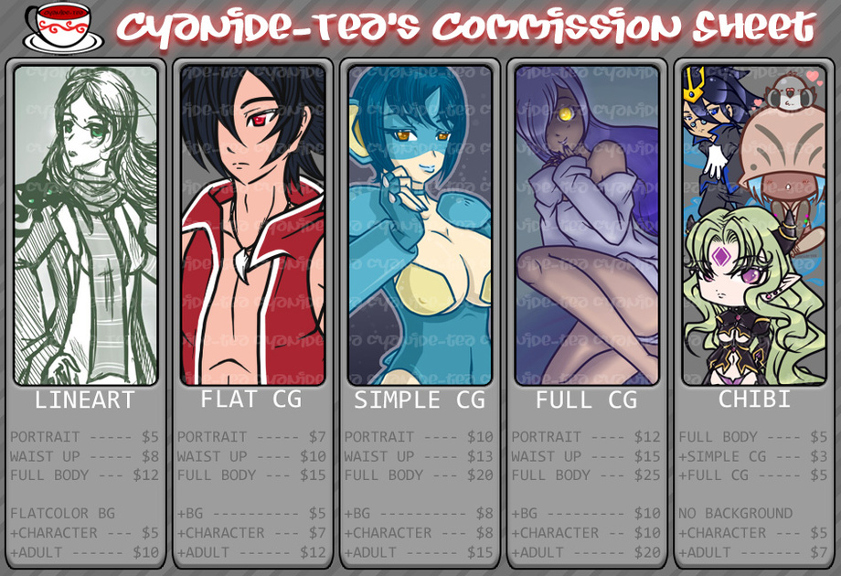 I am better known as Cyanide-Tea on DeviantArt and FurAffinity. Just posting my commission sheet here for future reference whenever I open them. A sheet showing the kinds of commissions I am open to whenever I do decide to open commissions. I figured this is much easier for people to understand than typing out all the information on a journal. Credit goes to fetalstar (FA) for this idea; certainly comes in handy!