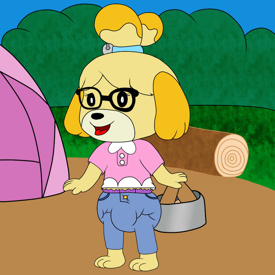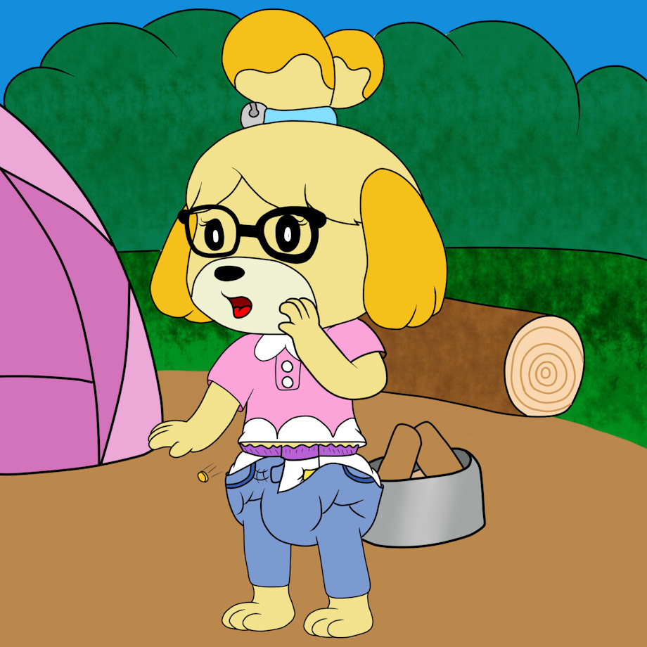Isabelle is a serious workaholic it got so bad the villagers made a partition to get her to take a vacation. she decided to go camping and before she knew it was getting off the train and on her way to the campsite. it was only After she got there when she found out they didn't have any bathrooms on site as not to affect the environment with a bunch of outhouses and gave Isabelle a diaper to use instead. Somehow she Actually managed to get her pants over that diaper and went about setting up her tent. with nothing but the sounds of the birds And a super thick diaper crinkling when she moved as Isabelle got used to the feeling of the padding around her tush she heard something. it sounds like trickling water Not realizing she was having an accident when the button of her pants broke as her pants fell to the ground leaving her diaper space to expand gasping as her pants fall to the ground Isabelle realizes how badly she needs to go and having nowhere else to go And already started she closes her eyes and does what her diaper is made for Isabelle sighs in relief having filled the first of many diapers on her vacation. It's a good thing they're provided by the camp for free. Though I get a feeling by the end of this she'll be taking a package or 2 home with her