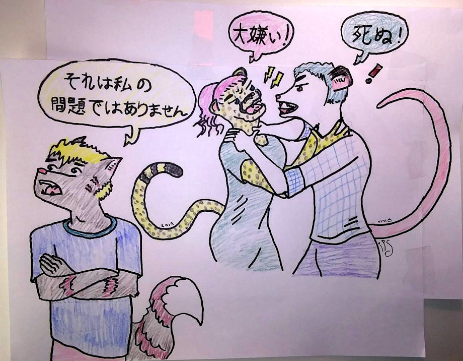 Wolf in forefront: "It is not my problem." Cheetah: "I hate you!" Possum: "Die!"