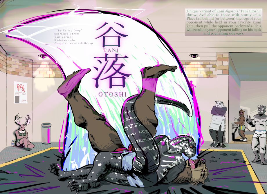 Of course, not knowing better, he pushed back to overcompensate.  He had no sense of balance at all.  So as he leaned forward to put more force into the resisting push, I caved in to the side.  I pulled his arm, locked against my shoulder at the elbow, across his front.  I moved most of my body out of the way but my tail, which with a quick jerk up, entangled itself across one ankle and behind his other leg's knee.  With one last light tug on his arm, it overbalanced him.  Tani otoshi, the valley drop throw:  it's served me well.  Technically, one is supposed to use a leg for the last little trip and lift, not a tail.  But you work with what you've got.