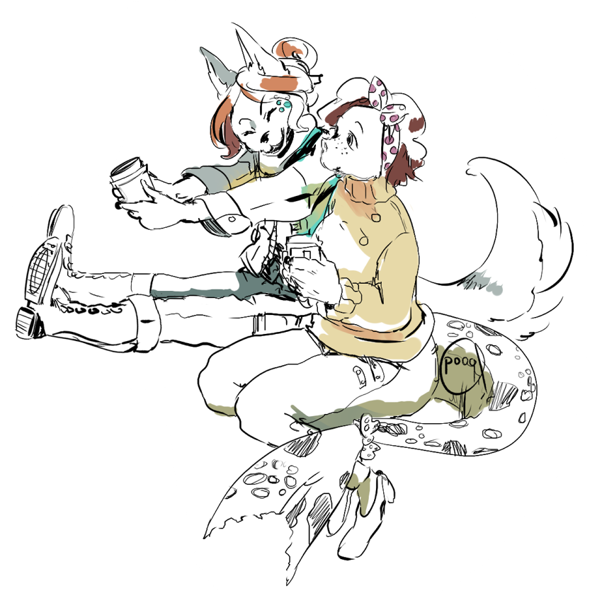 Nana and Denise enjoying some delicious lattes as the chill of the fall season begins to set in. Not that Denise really needs to actually wear the clothes to feel warm, she just likes how they look. X3