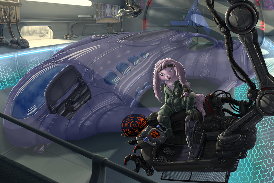 This Shunamir girl loves spaceships and working on them, she is staying a bit longer than than most others to do some precise maintenance work on this passenger ship.