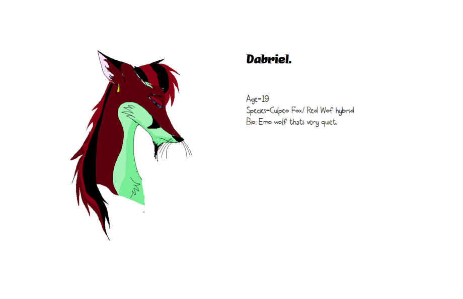 Also featured on my gallery on FurAffinity.net. This is my character. His name is Dabriel and he is a culpeo fox/red wolf hybrid. He is an emo fox wolf who dyed half of his fur greenish blue and his headfur red with black streaks. He is very quiet.