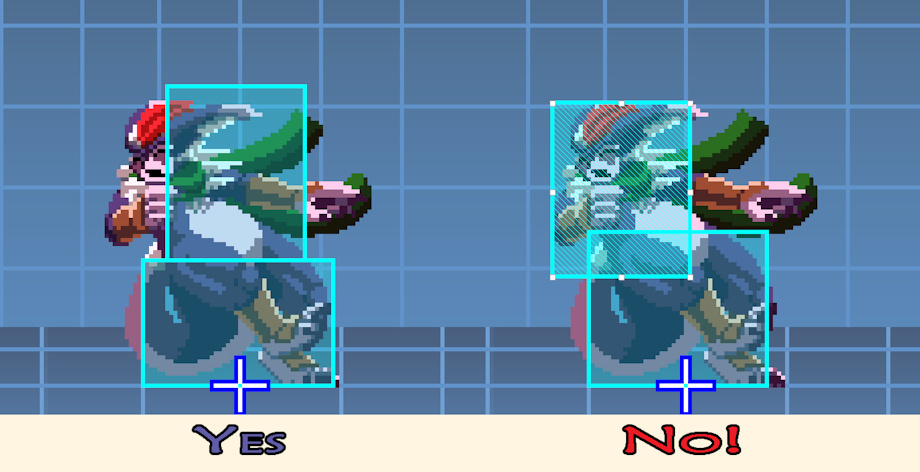 When making a characters get-hit animations, the hurt-boxes should stay consistent with the base pose from which the get-hit animation is based on. (Standing, crouching, in-air)