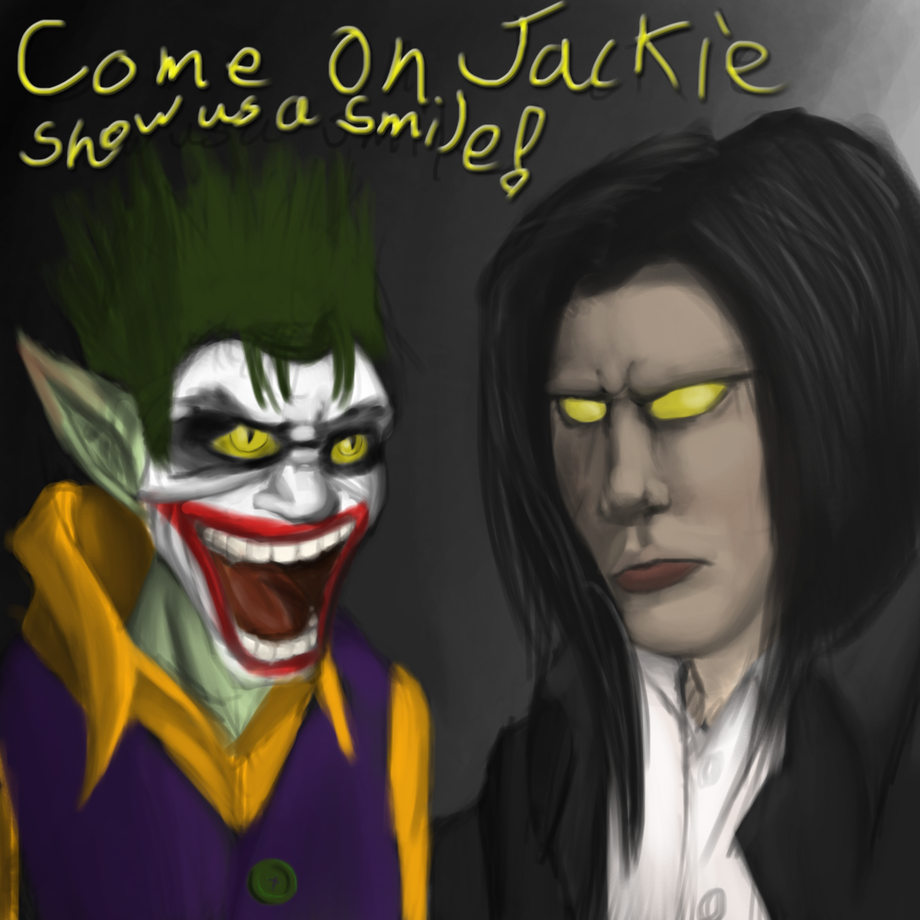 I keep telling myself that i only starting this two and a half hours ago, so i shouldn't feel too bad, but i kinda just want to cut Jackie out of this...I was all worried about how the crazy darkness goblin with his face done up like the joker would turn out and then realized i hadn't even started Jackie's...oh well, it's midnight, i'm out of time :/