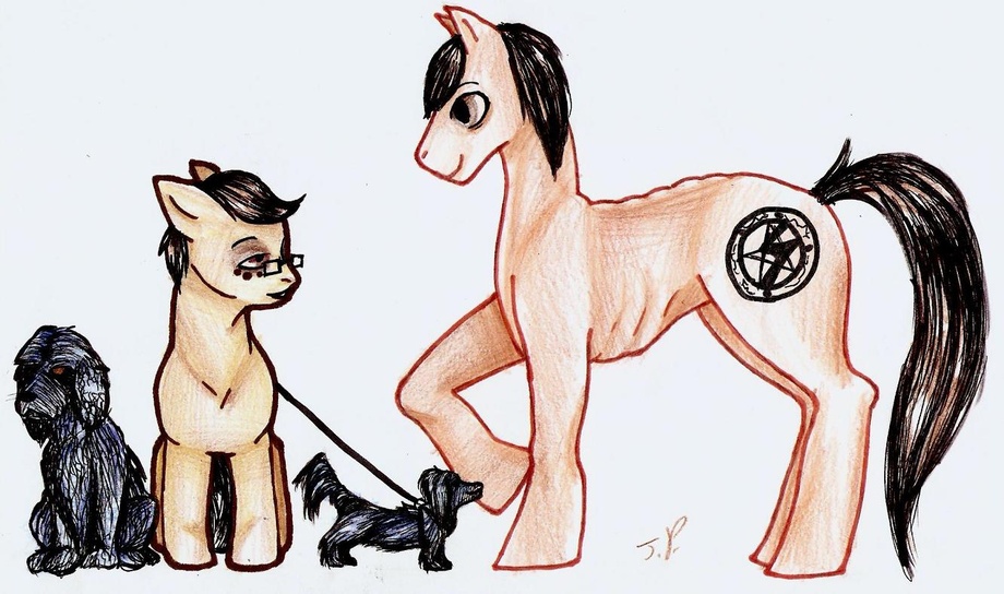 A drawing of my pony character (currently called Emo Squish thanks to bagelmoth ) , with her two dogs, a cocker spaniel named Quincy and a long-haired Dachsund named Turbo(based purely on my own two doggies of the like kind and features). The stallion in the pic is a very very super close friend of mine who I don't know if they want to be outed as a brony but they know who they are.