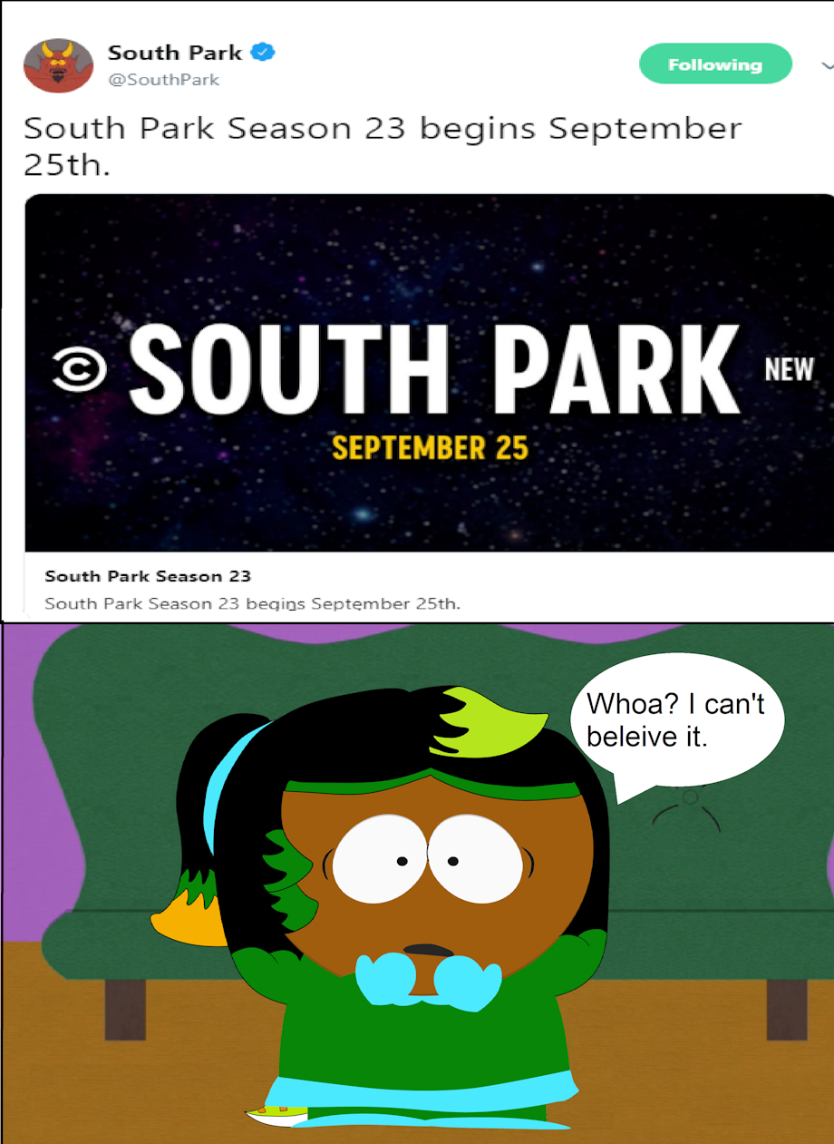 So Cole was looking throw her TV and she checked Twitter, then she seen this. And Announced of Season 23 of South Park, Cole is pretty shocked herself. After almost a year with out an announcement of South Park Season 23, she is shocked. She thought South Park was candled. It had her worried. Enjoy
