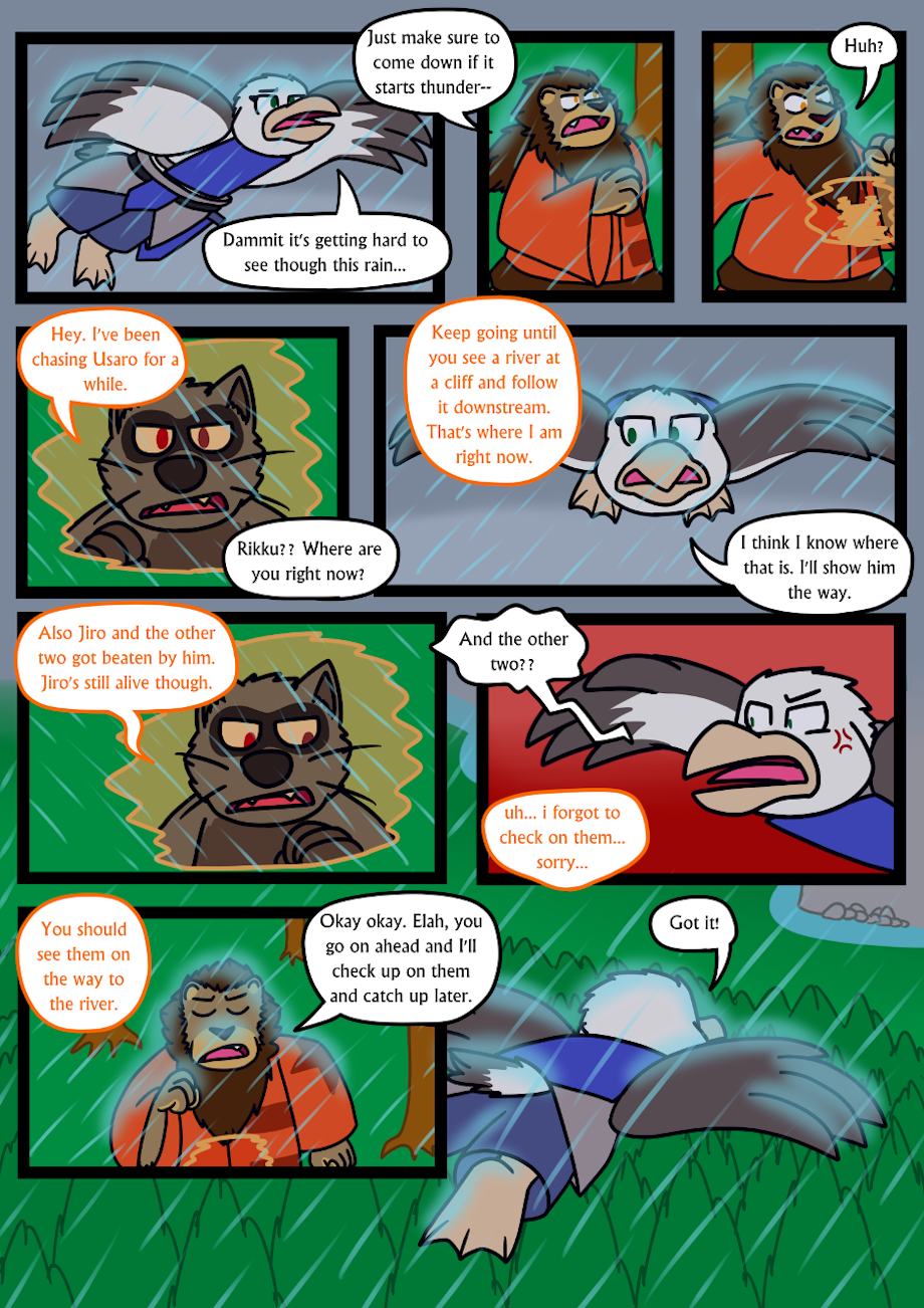 Rion's samurai group and Kuro's police squad chase after Usaro in the forest. Rikku challenges Usaro for the first time to see what he can do.