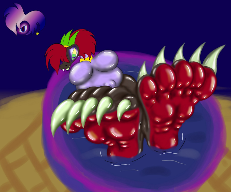 This is Krozyre Tsarah, the male Tsarah Novaninjian. He has been planned for awhile but after some deliberation, I decided to make him a Crosarah or based on a Crocodile. This image isn't complete as it's just me showing a new painting strategy I started employing recently, where I flat paint every color manually, then shade each body part on it's own. I actually like this strategy better as it gives me more freedom to update my art without being forced to rely on the lines I draw and I no longer need to be "perfect", I can just eyeball any changes I need to make. (So you can imagine for example, his chest and soles are all just a flat blob of red or purple, the shading is what gives it depth. I haven't shaded his head yet and the background...I still suck at backgrounds, but with this new technique, I can just add more to the piece as I need (I drew the water over his heels later on it's own layer.)