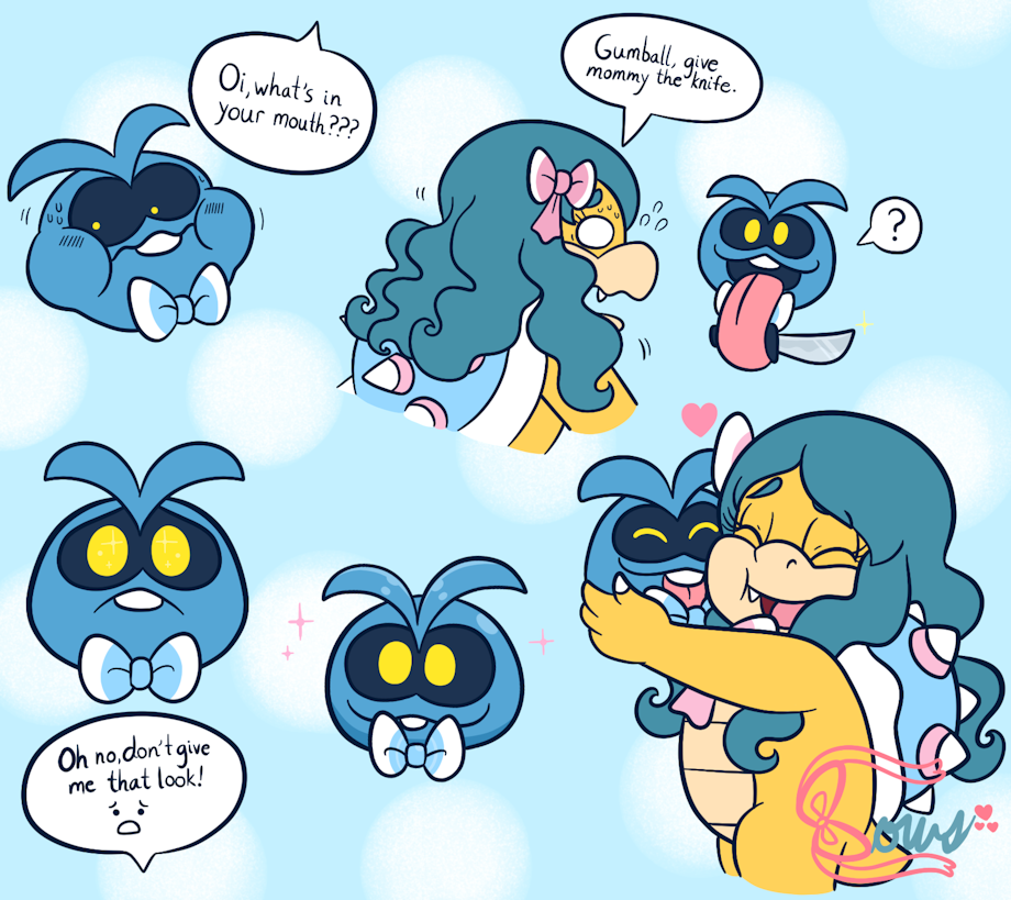 So after that, I thought about how cute it'd be if people in the Mushroom Kingdom were able to own tame versions of these viruses as pets. The tame viruses are unable to contaminate or infect anything they come into contact with, which is why they're not considered that much of a threat. And that's how I came up with my koopsona's pet virus named Gumball. Gumball is quite mischievous and can be a bit of a troublemaker at times, but even then he's a lovable sweetheart that loves getting attention : )
