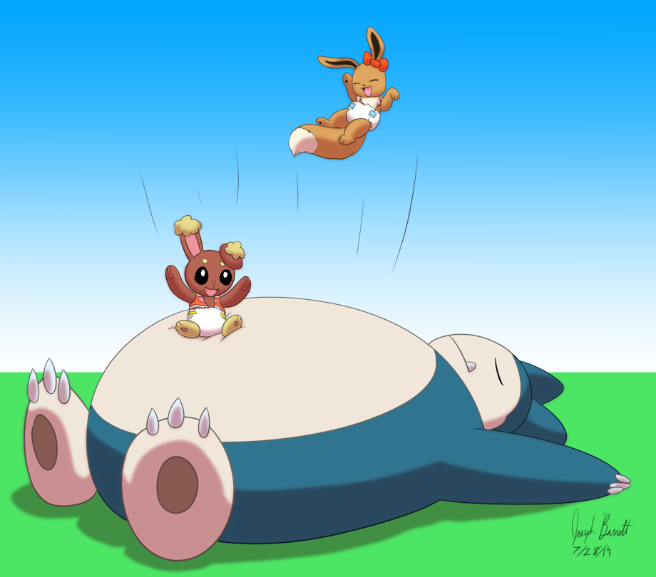 Dawn's baby Buneary & Amy's Eevee Ana bouncing on a sleeping Snorlax's tummy.