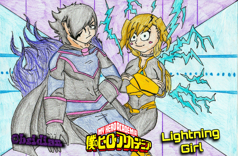 - both their costumes are made a special material that allows them to use their quirks more freely. Obsidian wears a cape and dark cloths along with a mask black mask that covers his face mostly for intimidation against villains and Sakurai's costume is more of a power suit that contains her surges allow her to feel more relax without going berserk.