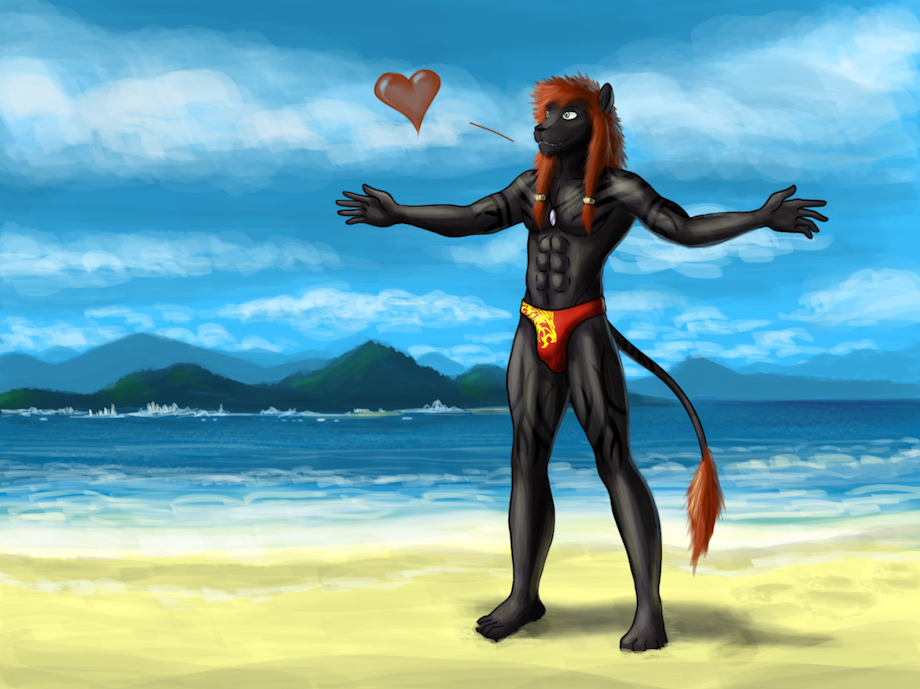 Commission for Besitius of his OC at the beach, ready to give a big loving hug to the ones he'll meet.