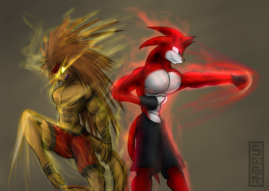 ----- My part of a trade with Super-100, featuring our two fighter characters - Achilles and Crimson. Was a nice idea I had, and a way to give something back to him after he had the kindness of doing drawings of me ^///^ Also with an extra effects version, just because I REALLY love doing those <3