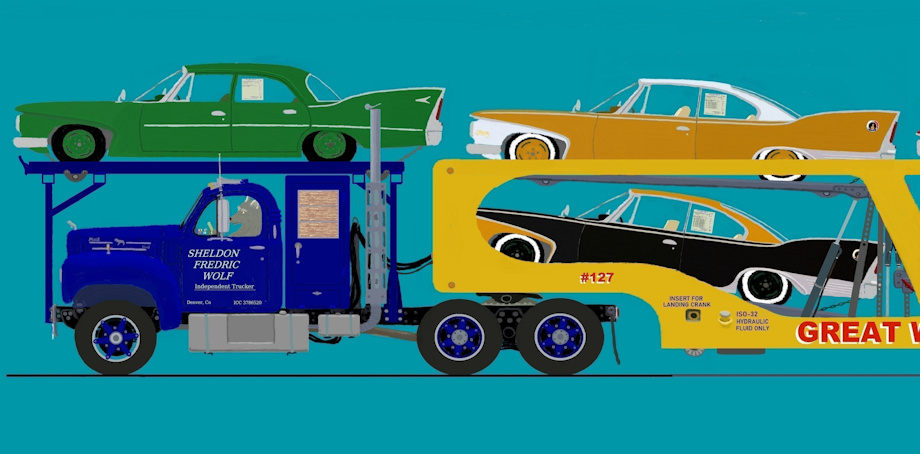 On a July weekend in 1960, Sheldon Wolf makes a run out from his hometown of Denver, Colorado with a load of new Plymouth automobiles to be delivered to dealerships in Antonito, Colorado, Albuquerque, New Mexico and Las Cruces, New Mexico. The Plymouth Fury nine passenger station wagon that Albert and Margret Coyote ordered is on this load, though not shown in this pic. No doubt it is noticed the cars don't have their wheel covers on...New cars come out of the factory with wheel covers and other accessories packaged up and placed on the back seat. The dealerships always put the wheel covers on new cars. Owner's manuals are in the glove compartments. And factory assigned titles and keys are kept in the cab of the truck with the driver.