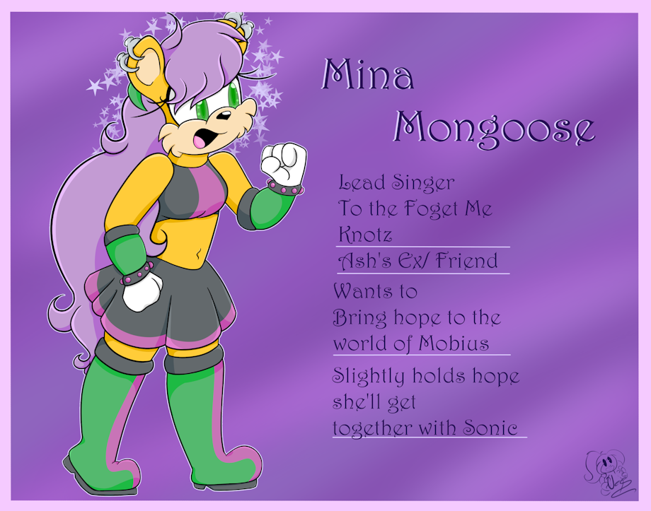 Mina Mongoose, friend to Ash Mongoose, and Sonic, and many others, she is a singer who helps bring hope to all of Mobius with her songs. She broke-up with Ash to try and figure things out with her feelings for a certain blue hedgehog, but still has no idea that her now ex and crush have been dating for awhile. she continues to be friends with Ash and has him for her manager, she sometimes feels guitly about breaking up with him, after the couple months she, has noticed he has been acting different he may still be tuff on the band for certain things but, that's seems normal for Ash, it's mostly he doesn't hang out alot with her now, he'll listen to when she needs talking to but if she wants to hang out after practice with the band, he'll say sorry and is busy and runs off home, she thinks maybe he is still hold a gruge on her for the break-up, so Mina thinks maybe if she sets him up with someone new since it's been awhile maybe he'll feel better, and maybe they'll be good friends like old times.