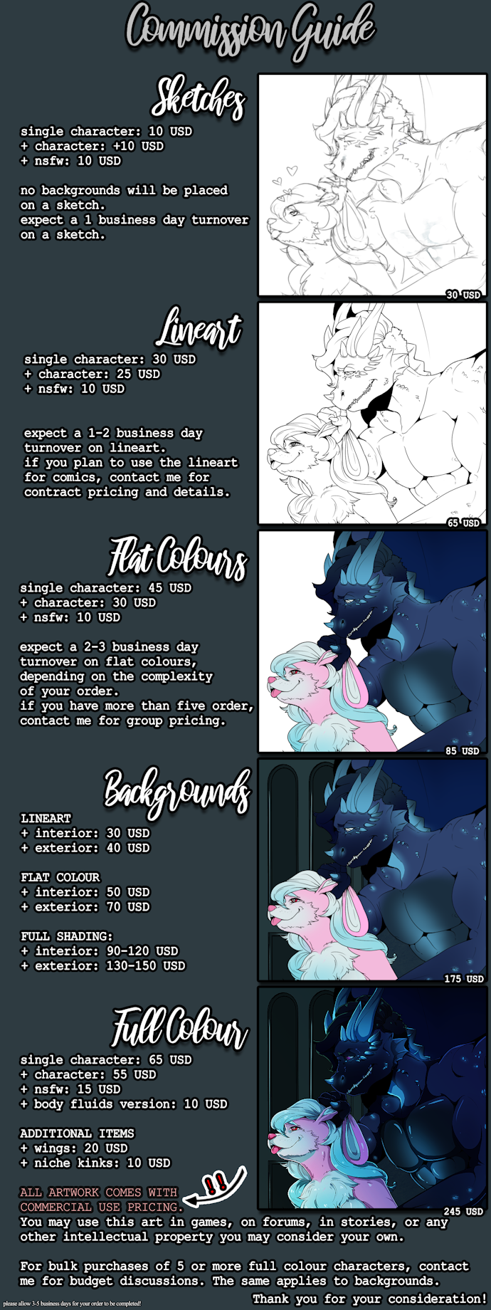 Group/bulk pricing is available: IF you have a commercial project and are expecting a lot of work needed from me. ** This requires signing and dating a legal contract, stating that: - I am the only artist working on the project in the designated section (backgrounds, characters, etc.) and you, as well as I, acknowledge that this is for artistic consistency. - You are aware of the timeline we have discussed and will adhere to it, as will I. - You are aware of the budget we have agreed on and will not alter it, nor will I. - You are aware of the alteration/revision cost (10 USD per alteration, maximum of three alterations) and will do your best to provide accurate, complete character sheets or examples to negate the need for revisions. - You will provide at least 2 weeks notice if you intend to terminate the contract, at which point half of the agreed total amount to finish the contract will be garnished in cancellation fee. ** This is both to ensure that you are prepared when you sign this contract, and that you are aware that I am working for you on a legal, taxable level.
