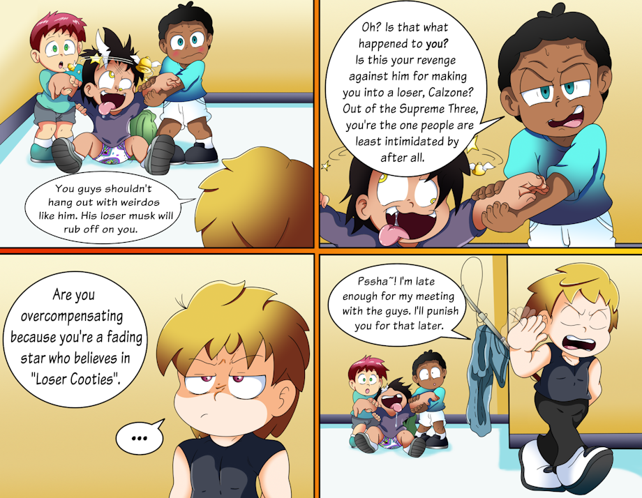 On their way home from school, we see that Ian has lended the shirt he got from the nurse's office to Bourbon to help cover himself. Bourbon, however, is clearly not wearing the shirt around his waist properly, as the underwear he's supposed to be covering is still visible. As they're walking, the conversation shifts to The Supreme Three and who they are. As we go down the line of the three of them, the most cloaked in shadow they are.