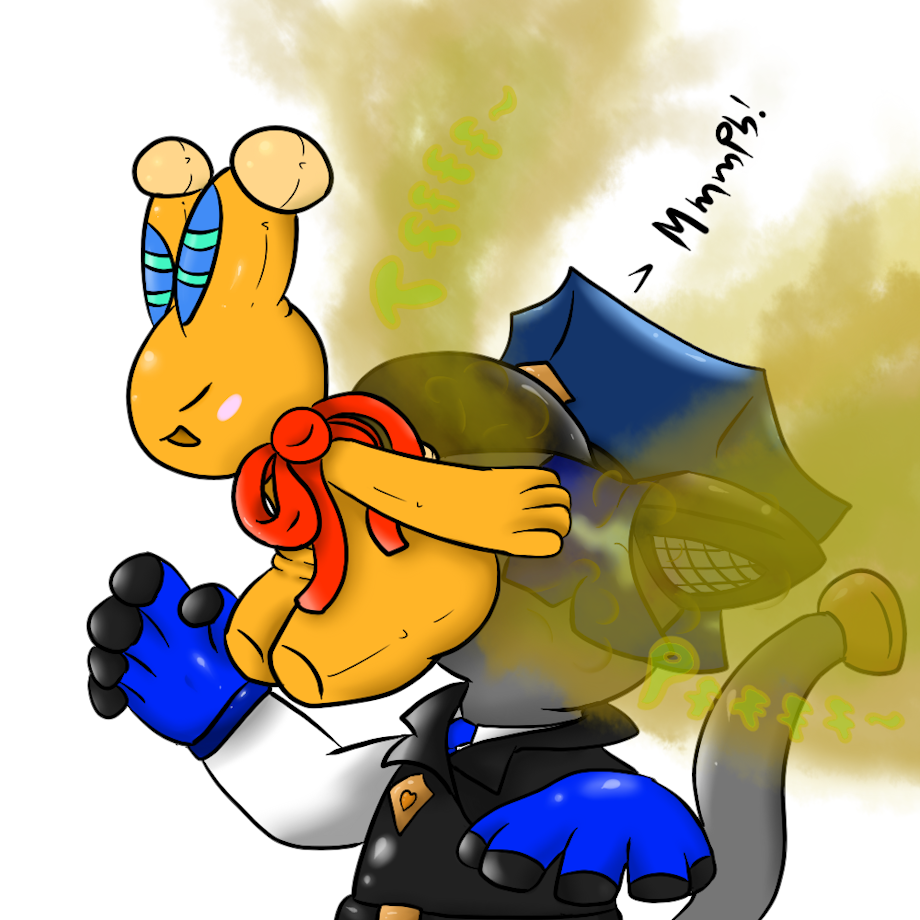 Here we have an old drawing I did of a dood from Fur Affinity's character, Clock the robocop cat, demonstrating why Georgie makes for a terrible mask. Unless you know what you're in for, I'd recommend keeping your face away from those buns. Even without releasing any of that pent up gas, those cheeks have a tendency to hold on to the remnants of many days worth of smelly emissions.