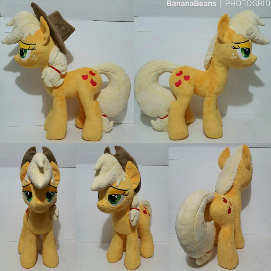 Applejack is 22 inches at the top of her bangs with magnetic hat. Made completely from Shannon mink with embroidered features. She has no beads or wiring in her at all aside from the tiny magnet hidden in her mane for her hat.
