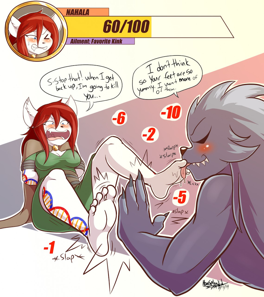 Nahala has once again fallen victim to another foot crazed fiend, who is now sucking away at her toes and deflecting any kicks of protest from her. It makes it even harder to fight since it's her favorite kink, which causes a debuff for her that drastically reduces her strength. She's definitely not getting out of this one. :P