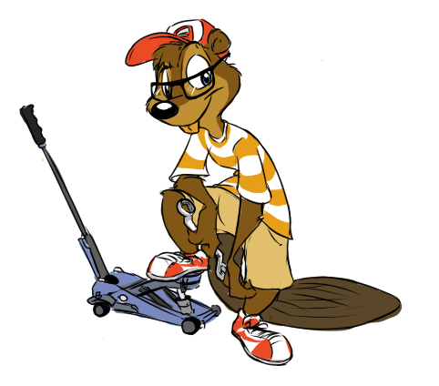 Lancer's a rally driver and mechanic, so I thought it'd be cool to see him posing with a floor jack and a wrench. :B I absolutely adore his glasses and hat. They make him look so cute! ^_^ His clothing just adds to the cuteness.